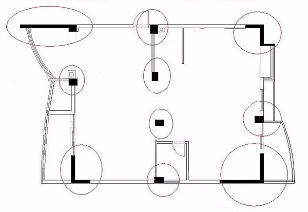 如果你有自己房屋的戶型圖,可以打開看看,如圖所示,在工程圖上標注為黑色的墻體就是承重墻,而標注為白色部分的墻體為非承重墻,這類墻體可以進行適量拆改。