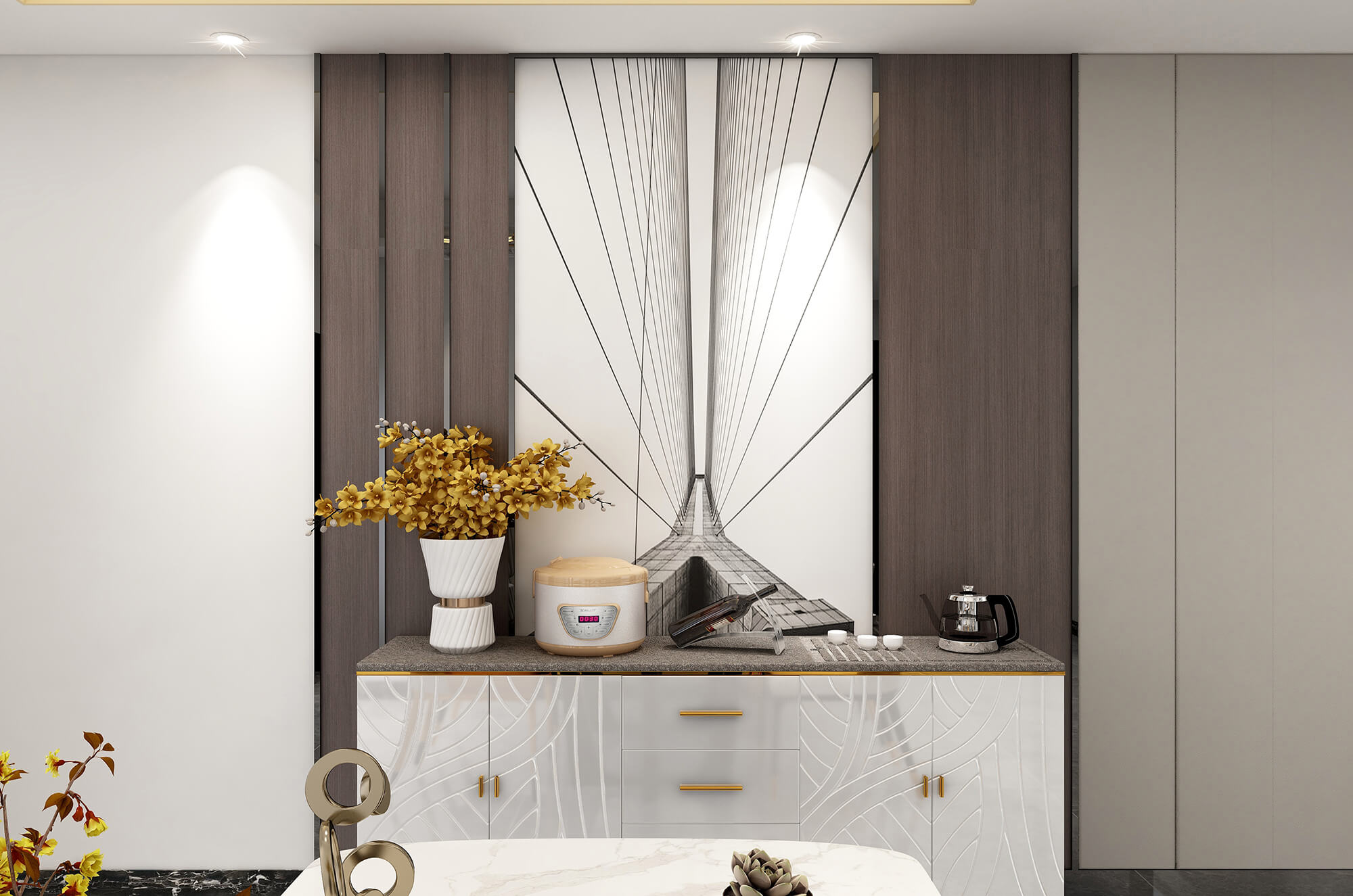 瀏覽量:539本案整體空間設(shè)計時尚大氣、舒適宜居。以淺灰為主色調(diào),在空間與家具中巧妙的糅合了金屬元素,營造出時尚前衛(wèi)的家居氛圍,適當(dāng)?shù)牟AР馁|(zhì)、亮色作為點綴,增添精致質(zhì)感,形成了獨具特色的現(xiàn)代簡約輕奢風(fēng)格。